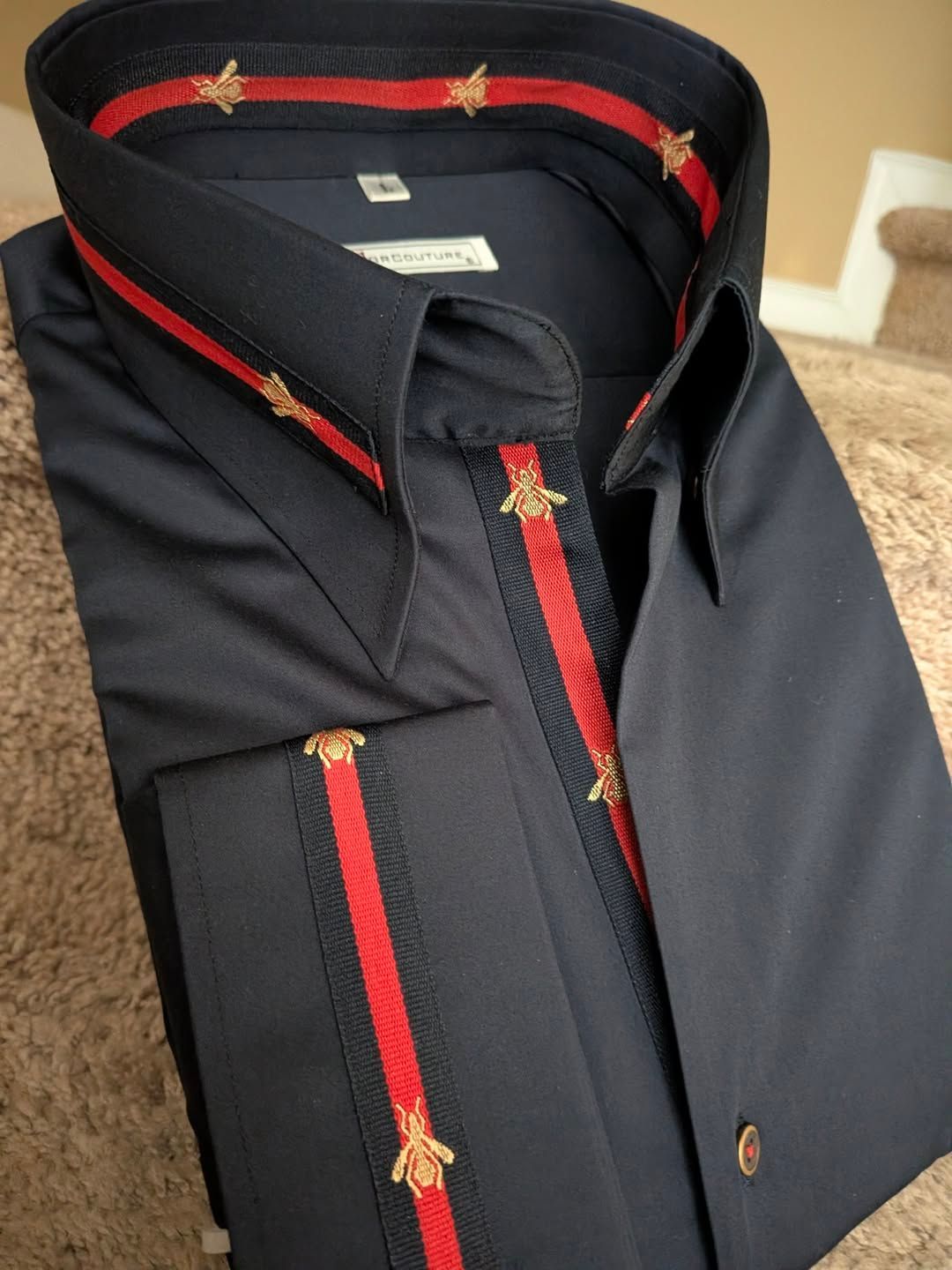 > MorCouture Navy Bee Trim Low Drop High Collar Shirt