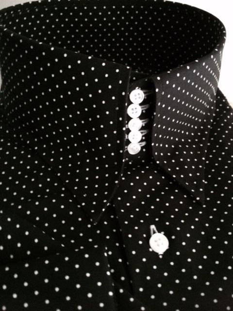 MorCouture Black White Pin Dot Centipede High Collar Shirt . 100% cotton. This hidden button down, Centipede collar shirt is accented with white buttons, white buttonholes and white button thread. French cuffs. A truly unique shirt for making your own fashion statement. Click image for larger picture.
