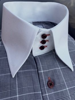 MorCouture Glen Plaid High Collar Shirt. 100% cotton, hidden button down collar, 3 button collar,