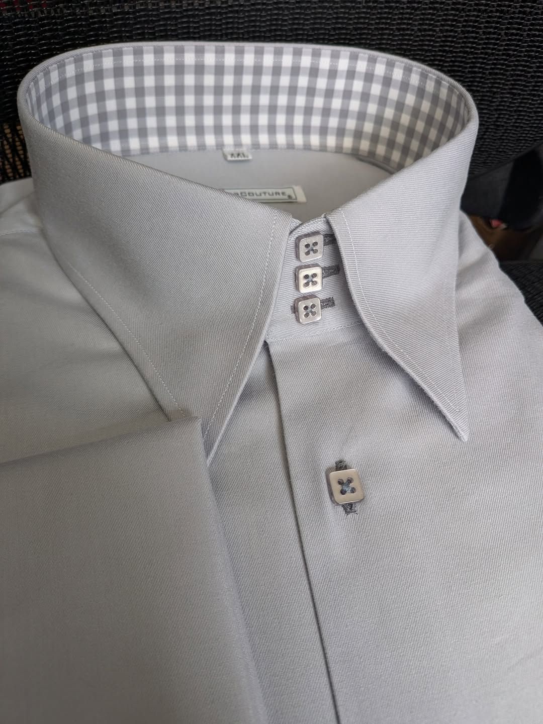 MorCouture Light Grey High Collar Shirt. 100% cotton. Can be made in 2, 3(default), 4 or 5 button collar with french cuffs(default) or 2 button cuffs. Specify options in comments section at checkout or call (908)510-5882. Special order 4weeks. Click image for larger picture.