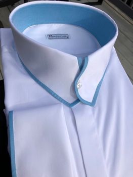 MorCouture White Aqua Trim Casanova Collar Shirt.100% cotton, 1 button Casanova collar, Hidden Placket, french(default) or 2 button cuffs. Custom orders take 3-4weeks. Trim can be done in any color(inquire). See top button cover options below. Click image for larger picture.