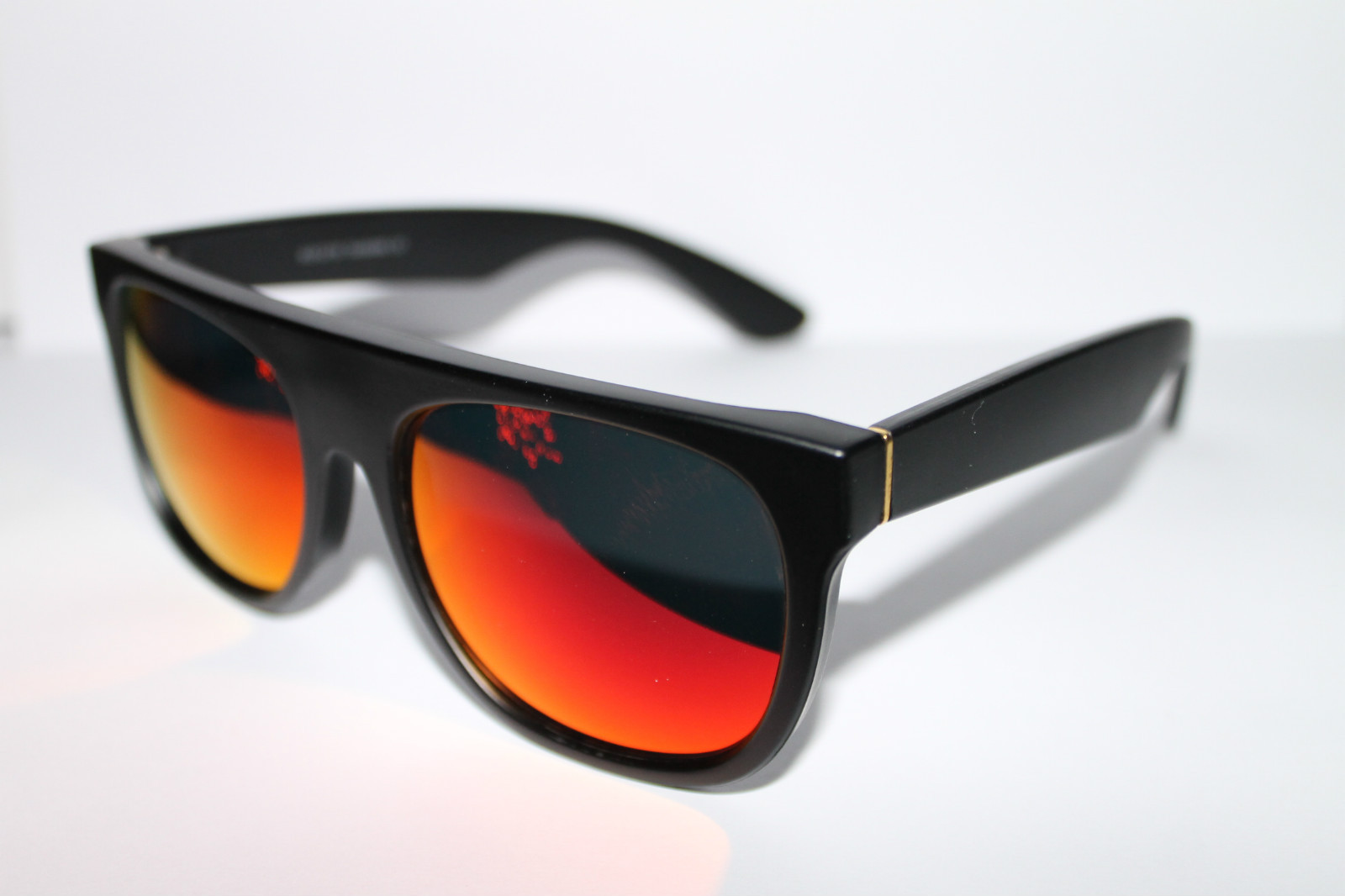 Mens Flat Black Frame Red Mirror Retro Sunglasses. 100% UV protection. (Click image for larger picture)